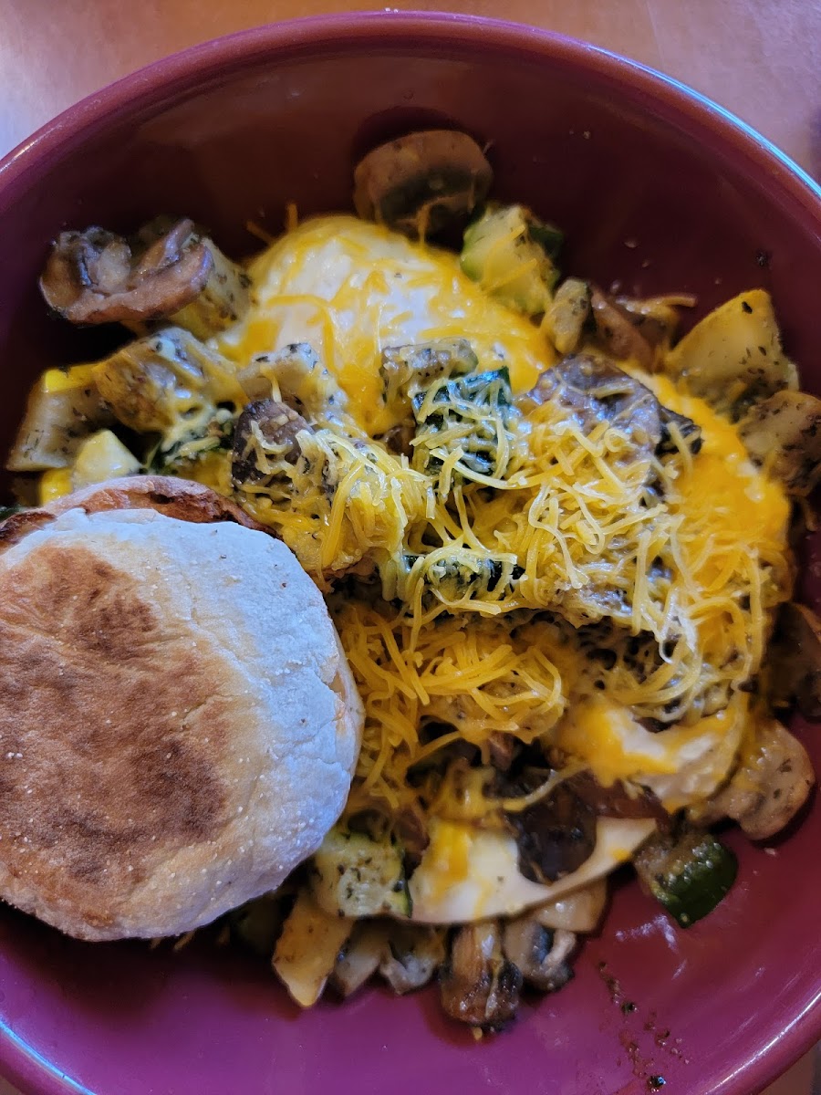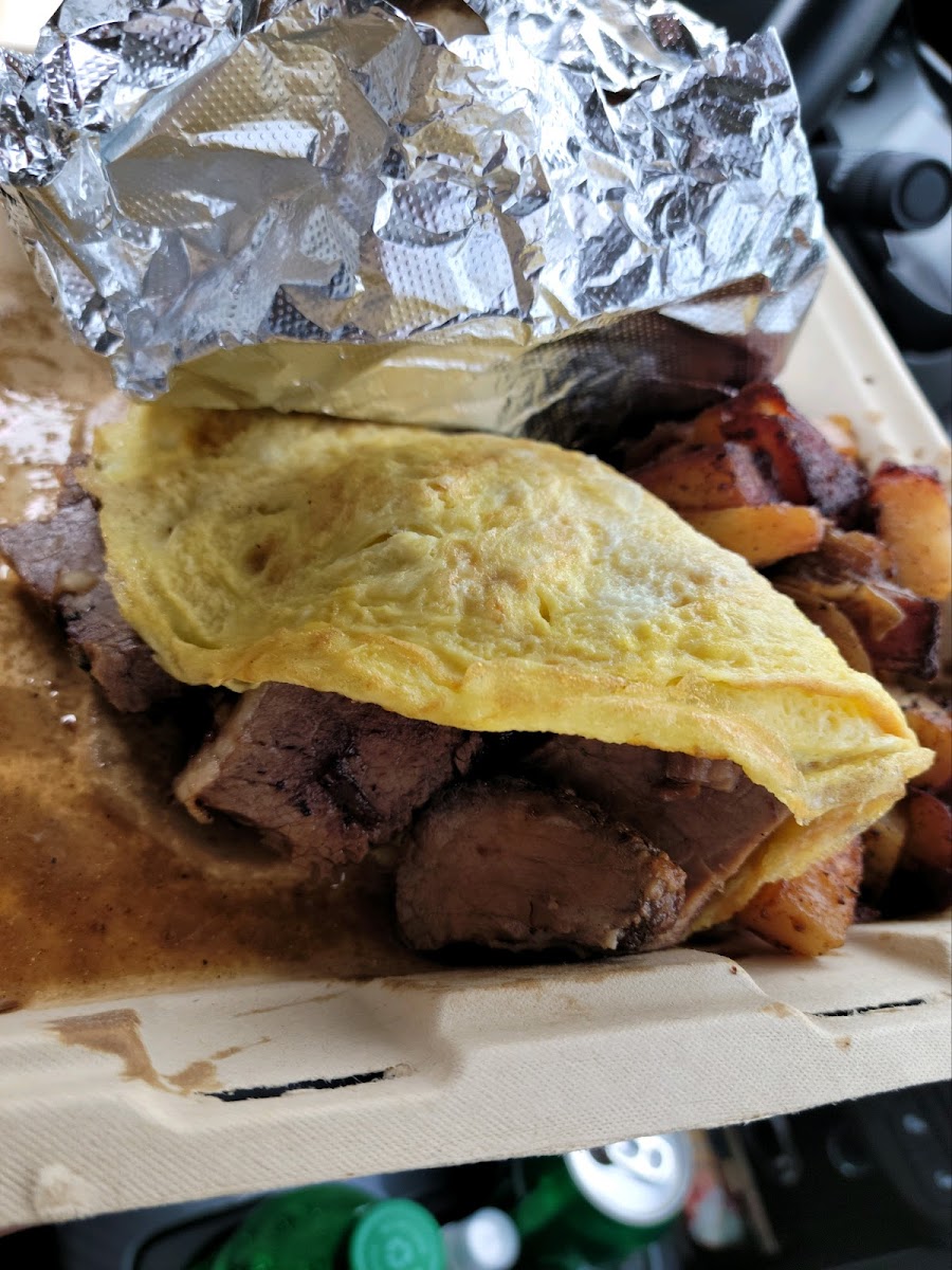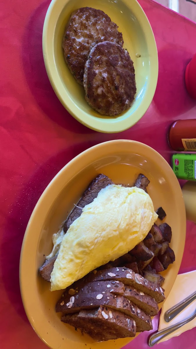 So glad we popped in here for breakfast! Good move to go a bit earlier than usual to beat the crowd. We showed up around 9am and it wasn’t too busy but the place was full by 10am. We got the brisket omelette and they’re stuffed French toast special. They were both delicious! The omelette came with a really good portion of brisket, breakfast potatoes, and toast. You can pick from different breads for you toast, so I went with challah. It’s a quirky joint, definitely worth going back to.